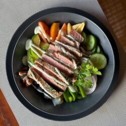 Spicy Indonesian rice with lemongrass marinated chicken satay, fried prawns, fried egg and crispy vegetable salad previous post Seared Tuna Poke Bowl next post Thai Green Prawns Curry